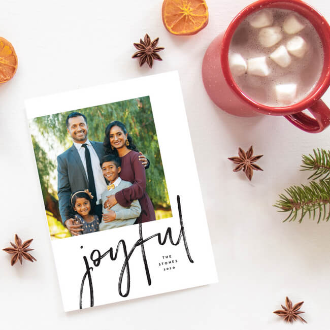 Joyful-photo-card-Basic_InviteRecently, trends have changed from the traditional family photo with everyone dressed up. The formal pose and attire have given way to more casual attire. A shot of everyone, including the fuzzies, with Santa hats and “ugly” Christmas sweaters creates a more playful, realistic image of the family.